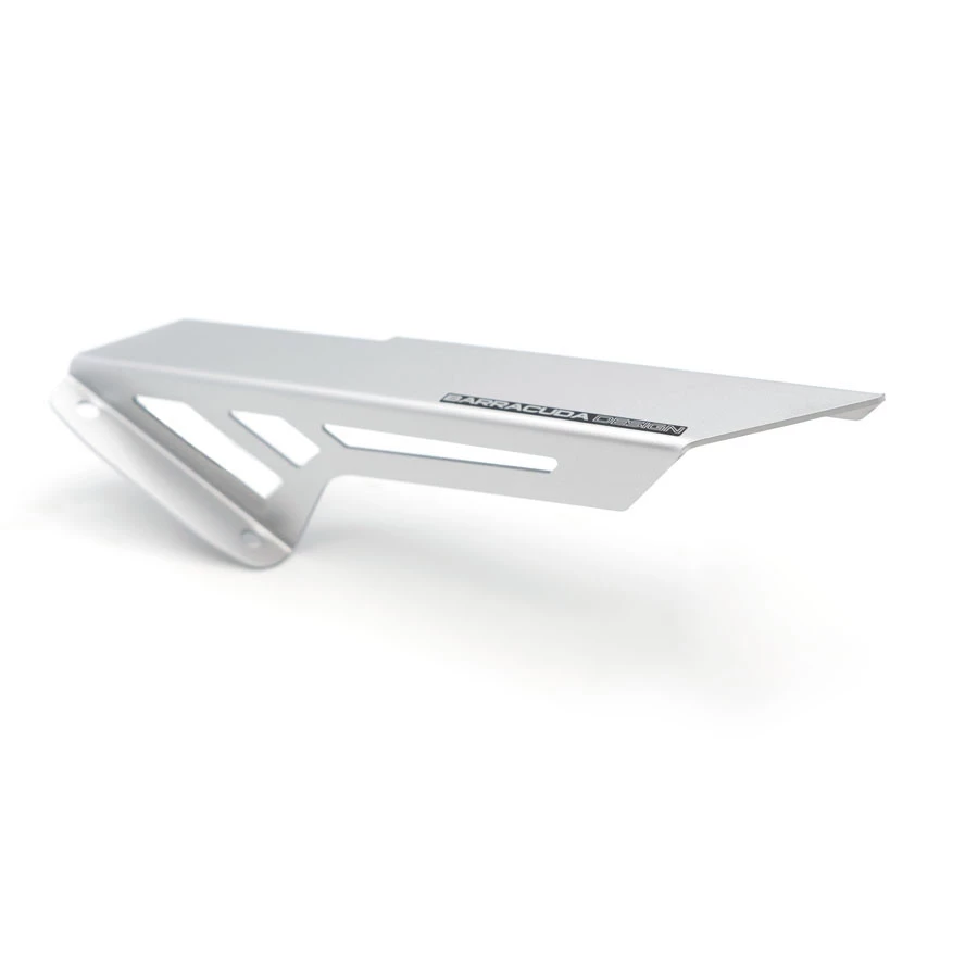 Il copricatena è realizzato in alluminio, verniciato argento. Monta direttamente sul paracatrena originale senza apportare modifiche, completo del kit di montaggio.