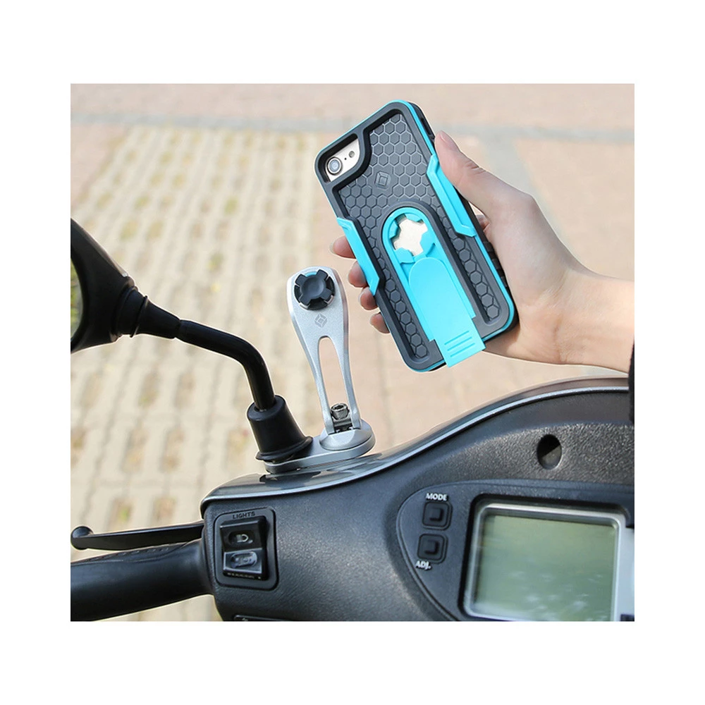 SUPPORTO SPECCHIO A+. Supporto di montaggio in alluminio per il posizionamento nel foro dello specchietto retrovisore M8, M10 o M12. Da utilizzare in combinazione con tutte le cover X-Guard, fissaggi universali. Metodo di montaggio doppio, può essere utilizzato come montaggio a specchio o montaggio su testa a sfera (in combinazione con adattatore)