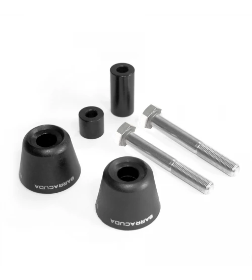 Il KIT TAMPONI BARRACUDA è venduto in set ( dx-sx ), ed è completo di tutto il necessario per il montaggio . I TAMPONI hanno la testa in PVC nero + distanziali in alluminio anodizzato + bulloneria specifica . Si monta senza alcuna modifica alle parti originali . Istruzioni di montaggio figurate comprese.