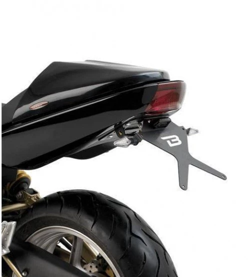 Il portatarga reclinabile e’ realizzato in alluminio anodizzato nero + snodo in acciaio che ne garantisce la robustezza alle vibrazioni. Il kit e’ specifico per la moto ed e’ comprensivo di staffa di fissaggio e di bulloneria. Il montaggio non prevede modifiche alle parti originali per il montaggio. Non sono compatibili frecce e luce targa originali. N.B. Luce targa e frecce vanno acquistate separatamente.
