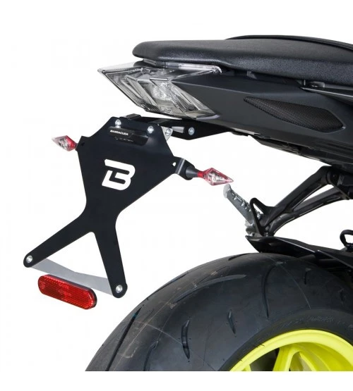 Il portatarga reclinabile e’ realizzato in alluminio anodizzato nero con snodo in acciaio che ne garantisce la robustezza alle vibrazioni. Il kit è specifico per la moto ed e’ comprensivo di staffa di fissaggio e di bulloneria. Il montaggio non prevede modifiche alle parti originali. Non sono compatibili frecce e luce targa originali. N.B. Luce targa e frecce vanno acquistate separatamente.